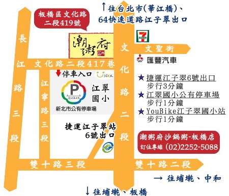 板橋江翠店資訊 選單 關於我們 板橋江翠店資訊 土城中央店資訊 【 板橋江翠店 】 地址:新北市板橋區文化路二段419號 電話:(02)2252-5088 營業時間: 週一至週日 11:00-14:00 . 17:00-21:30 ( 最後入店及點餐為打烊前30分鐘 ) 離江子翠捷運站6號出口,只要3-5分鐘的距離隔壁有江翠國小停車場,交通非常方便 週邊停車資訊 (非特約)→【江翠國小地下停車場】每小時30元 Facebook臉書連結 《 Google地圖連結,點選較大地圖 》