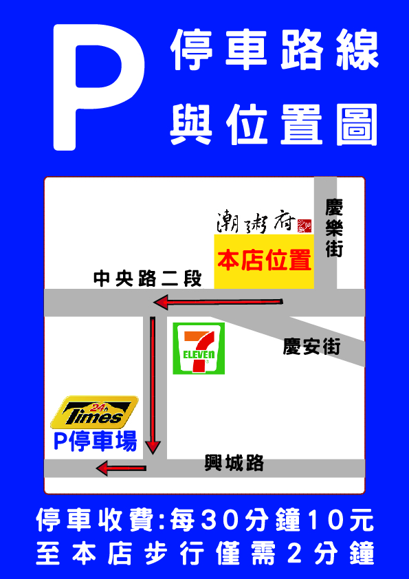 【土城店訊息】好消息!新增停車場相關資訊 開車族好消息 潮粥府土城店附近出現新的停車場了! 距離190公尺步行只要3分鐘! Times 24h土城興城路停車場 停車場地址:新北市土城區興城路112號 收費方式: $10元/每30分鐘 停車後每12小時收費100元 車位約47個 以後攜家帶眷來用餐不用再煩惱找不到車位了,貼心的小編先幫各位貴賓探路,從本店斜對面7-11旁巷子進入後,往前20公尺右轉就到囉~ 是.不.是.超.近.的 趕快揪親朋好友來潮粥府享用料好味美的沙鍋粥吧! 訂位專線:(02)2265-9968 地址:新北市土城區中央路二段328號 如有任何疑問歡迎來電洽詢哦~謝謝! 回上一頁